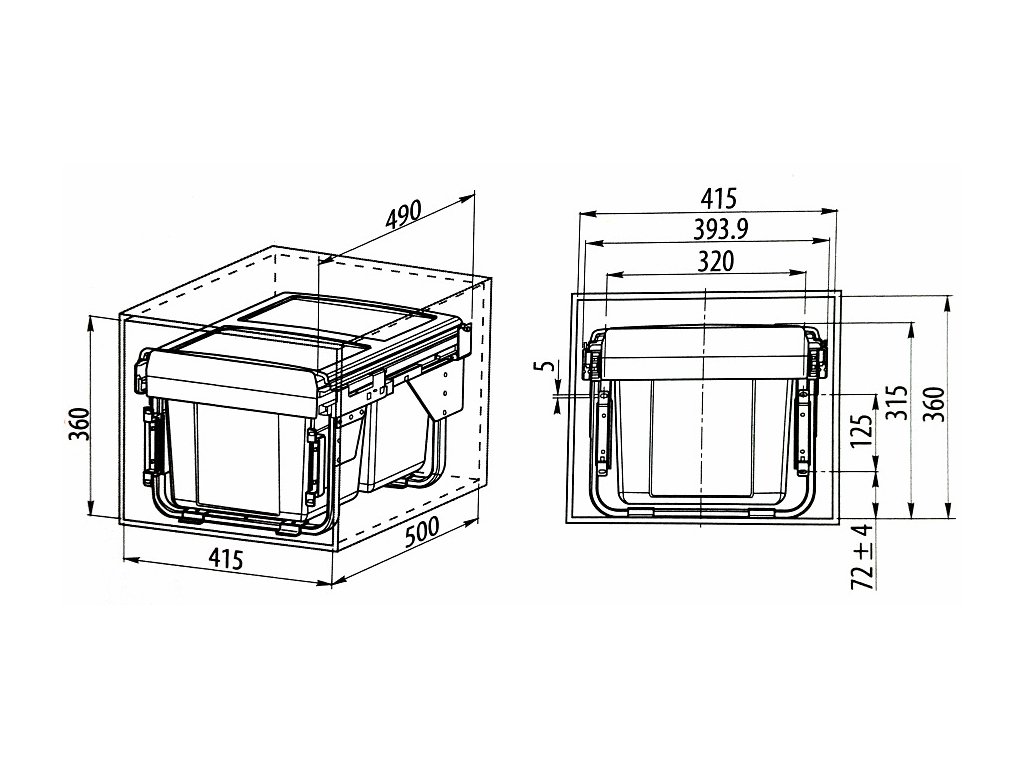 Odpadkový kôš pre kuchynské linky a kancelárie. Kovanie výsuv s doťahom a dotlmením. Montáž na dvierka, vyťahuje sa s otvorením dvierok. Možnosť montáže pod drez.